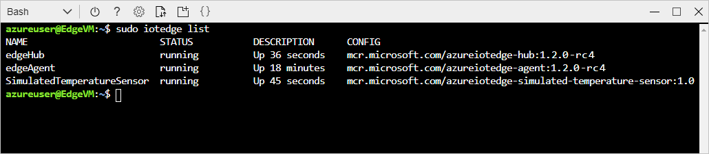 连接到虚拟机后,验证是否已在 IoT Edge 设备上成功安装并配置运行时。