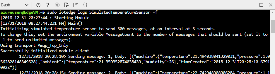 sudo iotedge logs SimulatedTemperatureSensor -f