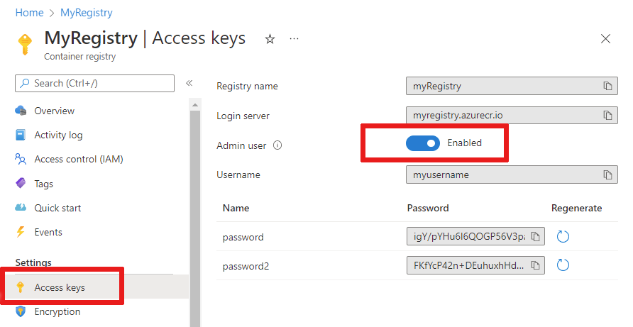 用切换按钮启用“管理员用户”,查看容器注册表的“用户名”和“密码”。
