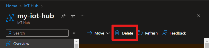 若要删除 IoT 中心,请在Azure 门户中打开 IoT 中心,然后选择“删除”。