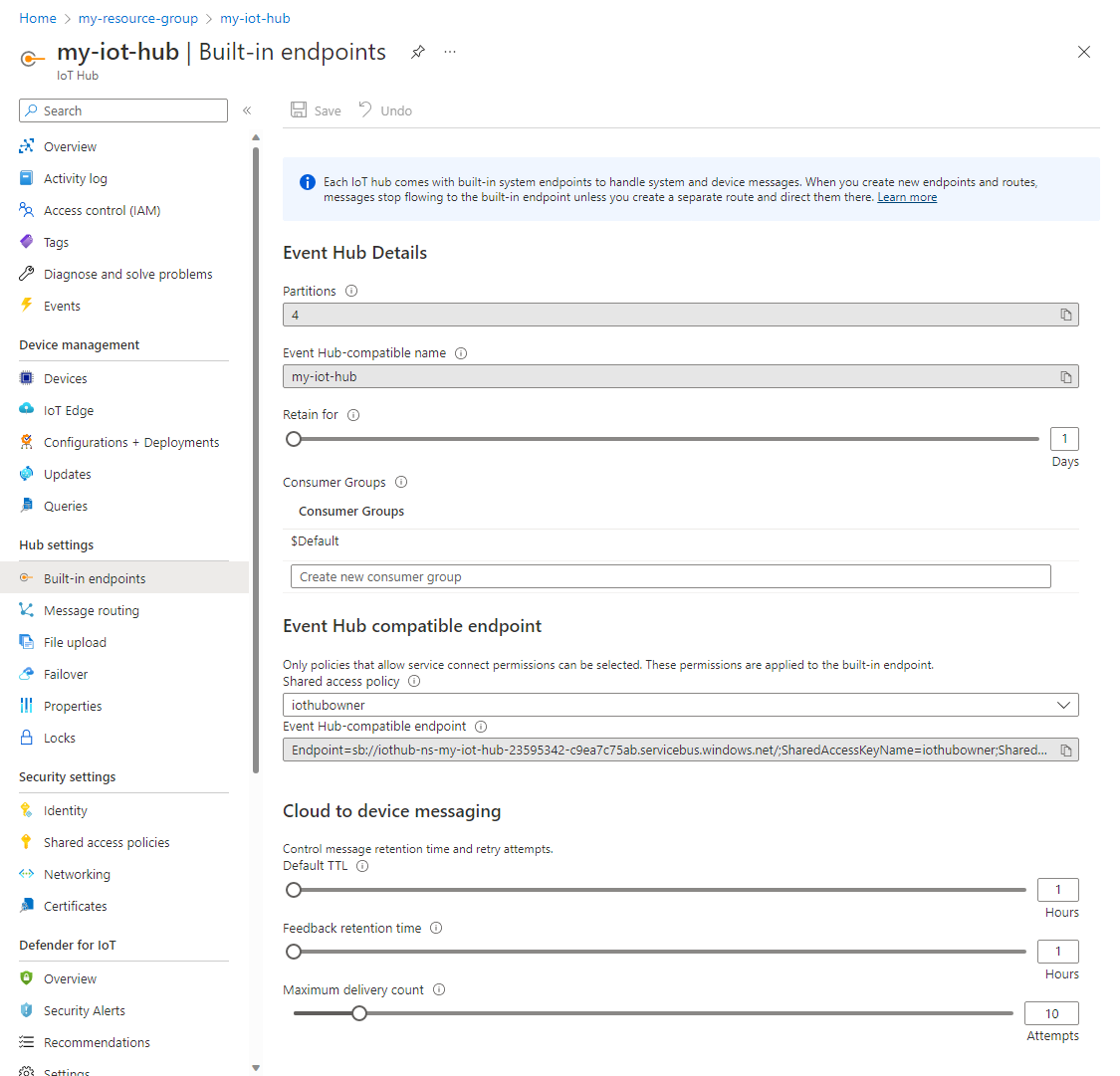 | 保留时间 | 此属性指定 IoT 中心保留消息的天数。 默认值为一天,但可以增加到七天。 |
