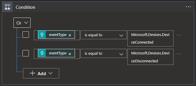 在满足特定的条件后,该条件可帮助运行特定的操作。 在本文中,条件是检查 eventType 是设备已连接还是设备已断开连接。 当 eventType 为 true 时执行的操作是在 Azure Cosmos DB 中创建文档。 此条件是在“逻辑应用设计器”中创建的。