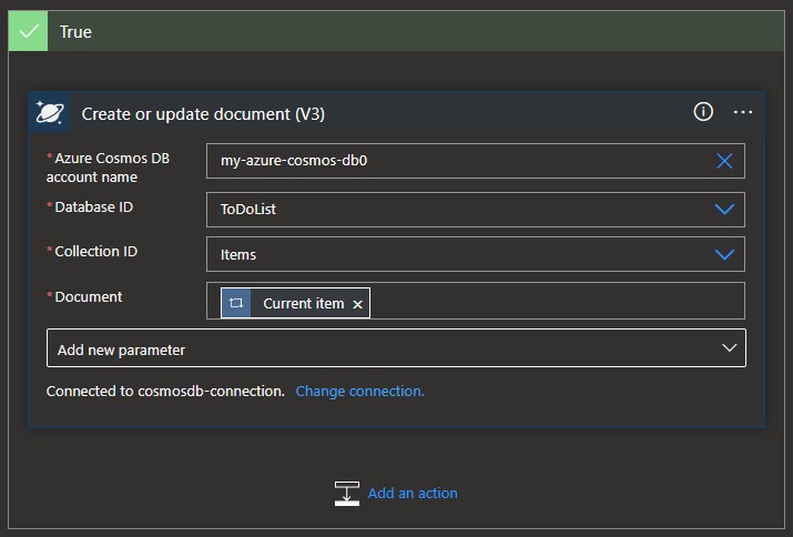 搜索 Cosmos DB 并选择“Azure Cosmos DB — 创建或更新文档(V3)”