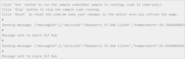 此时会显示类似于以下输出的信息,其中显示了传感器数据以及发送到 IoT 中心的消息。
