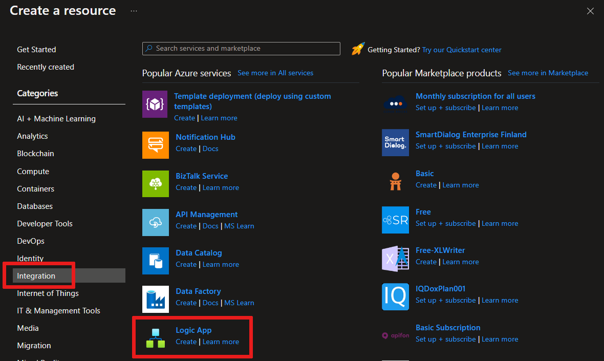 在 Azure 门户中,依次选择“+创建资源”、“集成”、“逻辑应用”。