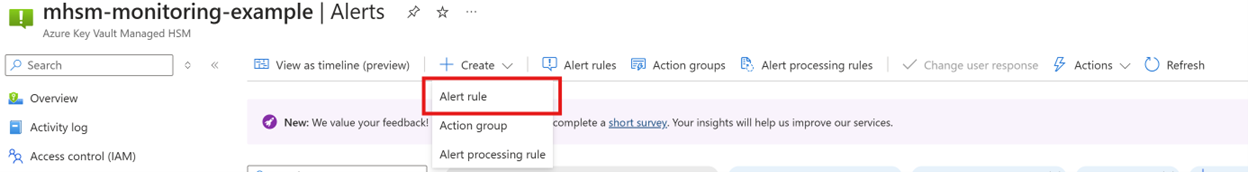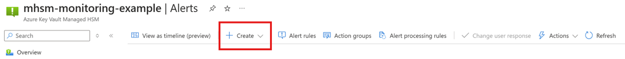 在 Azure 门户中选择 HSM 资源,然后选择“监控”下的“警报”。