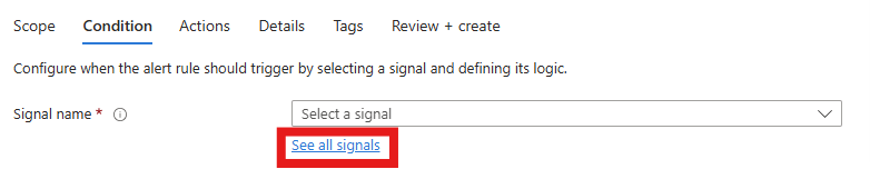 选择定义警报逻辑的阈值。 可以通过选择“查看所有信号”来查看所有可用信号。 托管 HSM 团队建议为大多数应用程序配置以下阈值,但你可以根据应用程序需求对其进行调整: