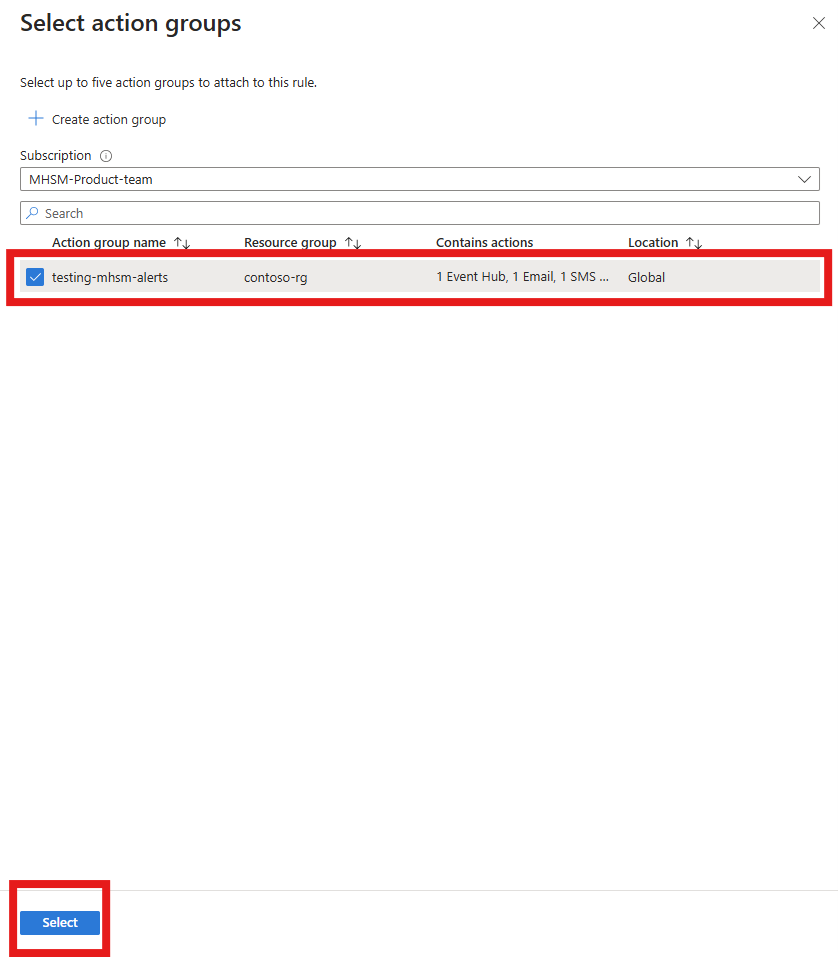 选择要应用于警报规则的操作。 本示例将添加一个现有操作组。 选择操作组,然后选择“选择”。