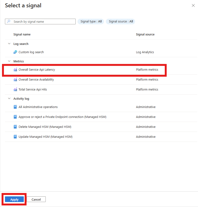 选择“整体服务 API 延迟”作为信号名称并选择“应用”。