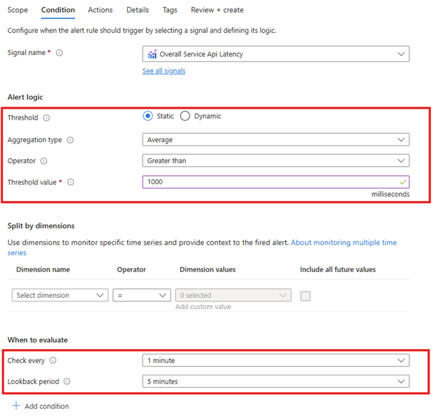 设置 1000 毫秒阈值的目的是通知该区域的 Key Vault 服务的工作负载高于平均水平。 我们的密钥保管库操作的服务水平协议(SLA)要高出数倍。 有关目前的 SLA,请参阅联机服务的服务级别协议。 若要在 Key Vault 操作超出服务级别协议时发出警报,请使用服务级别协议文档中的阈值。