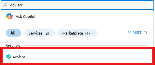 在 Azure 门户中搜索“顾问”,然后选择“顾问”服务。