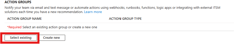 选择一个“操作组”。 本示例将选择一个现有操作组。 最多可选择 5 个操作组并附加到警报规则。 选择“选择现有”,将弹出一个侧面板。选择现有操作组。