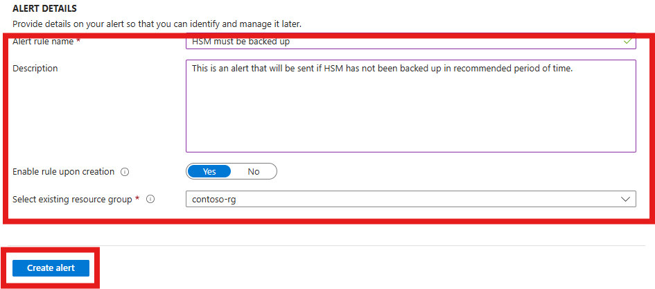 本文介绍如何在指定阈值下配置警报,以便在 HSM 运行不正常时立即提醒团队采取行动。 可以配置发送电子邮件的警报(最好是发送到团队通讯组),触发 Azure 事件网格通知,或者拨打电话号码/发短信。