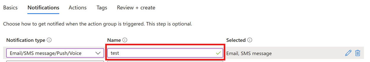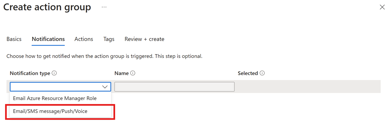 为操作组选择“通知类型”。 本示例将创建电子邮件和短信提示。 选择“电子邮件/短信/推送/语音”。
