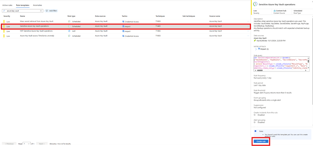 使用与用例最匹配的规则模板。 在此示例中,我们选择“敏感 Key Vault 操作”。 在显示的边栏中选择“创建规则”。