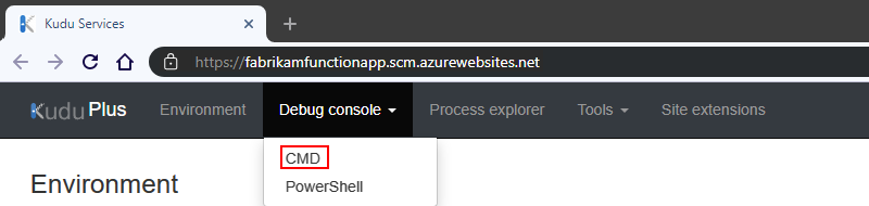 Kudu 服务页面打开后,在 Kudu 网站的标题栏上,从“调试”控制台菜单中选择“CMD”。