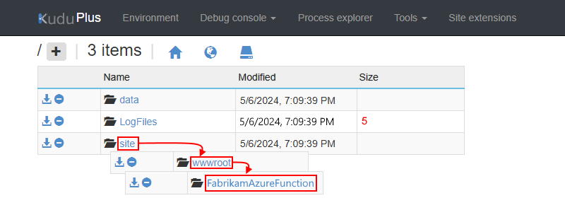 在下一页上,从文件夹列表中选择 站点>wwwroot>your-function。