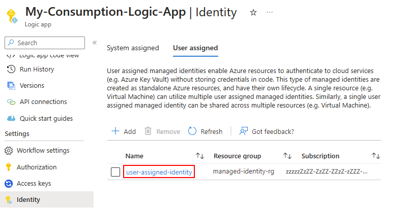 对于此方案,需要在逻辑应用资源级别设置用户分配的托管标识。 工作流对 Azure 函数的调用使用此托管标识进行身份验证。