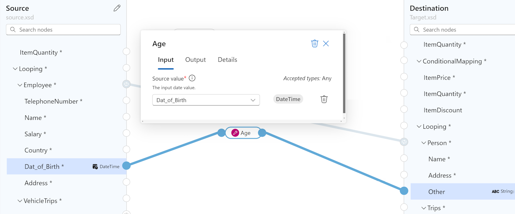 以下示例显示了一个名为 Age 的自定义函数,该函数返回提供的出生日期的年龄。 该函数连接到 Dat_of_Birth 源节点 和其他目标节点 。 若要查看此自定义函数的定义,请参阅 “查看示例函数定义”。