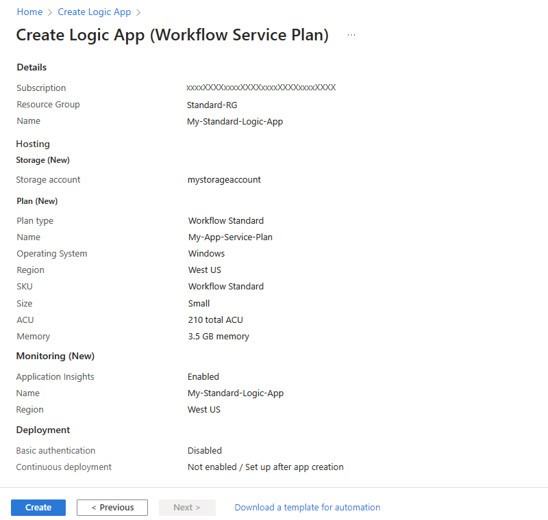 注意:请勿使用基于 Linux 的应用服务计划。 仅支持基于 Windows 的应用服务计划。定价计划 是 < 定价层> 用于逻辑应用和工作流的 定价层。 你的选择会影响逻辑应用和工作流使用的定价、计算、内存和存储。