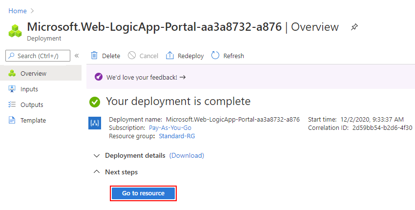 在部署完成页上,选择“转到资源”,以便可以添加空白工作流。