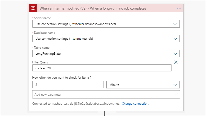 作业完成后,作业将更新 LongRunningState 表。 在不同的工作流中,可以使用名为“ 当项目被修改时”的触发器来触发结果。 如果不需要输出,或者已有监视输出表的触发器,则可以跳过此部分。