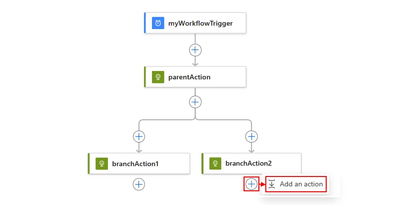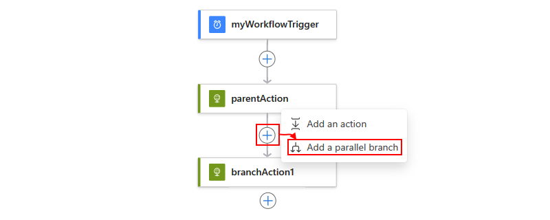 若要将另一个操作添加到并行分支,请在要添加新操作的操作下,选择加号 (),然后选择“添加操作”+。