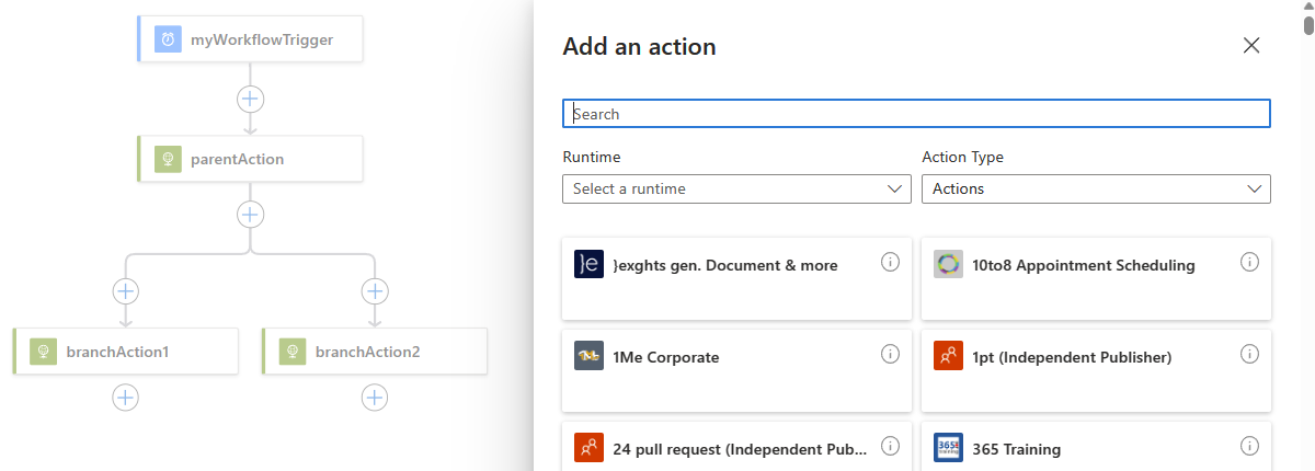 在并行分支中添加您希望运行的操作。 在“添加操作”窗格和搜索框中,找到并选择所需的操作。