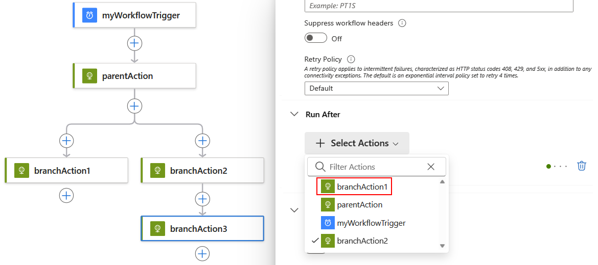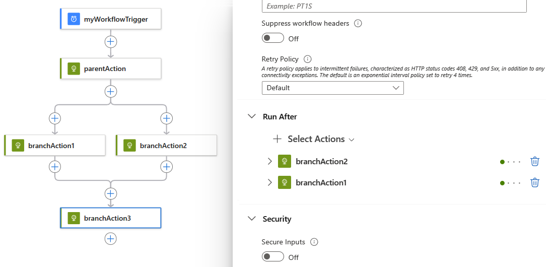 runAfter并行分支的属性值与父作的完成状态匹配时,并行分支才会运行。 例如,仅当 parentAction 以“成功”状态完成时,分支 BranchAction1 和 branchAction2 才会运行。工作流会等待同一级别的所有并行分支完成,然后运行用于合并这些分支的动作。