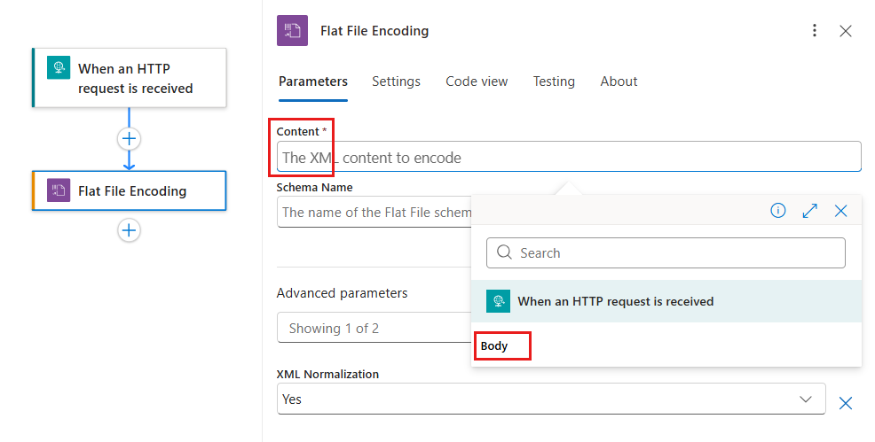 如果 正文 未显示在动态内容列表中,请在 “收到 HTTP 请求时 ”部分标签旁边选择“ 查看更多”。 还可以直接在“内容”框中输入要编码的内容。