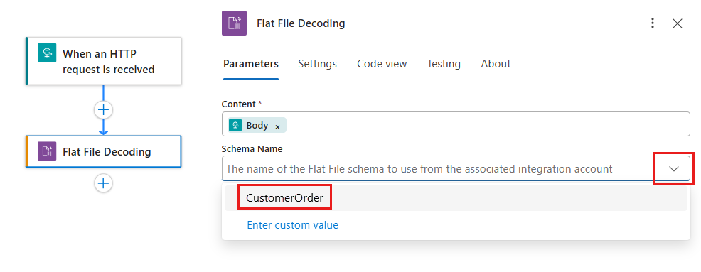 在标准工作流中,平面文件操作允许你从链接的集成帐户中选择架构,或者选择之前上传到逻辑应用的架构,但不能同时从两者中选择。