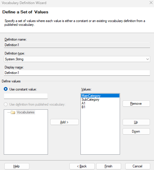 可以创建词汇定义作为常数值、值的范围或值的集合,或者作为 .NET 程序集或 XML 文档中的元素。 可以使用词汇定义向导来创建词汇定义。