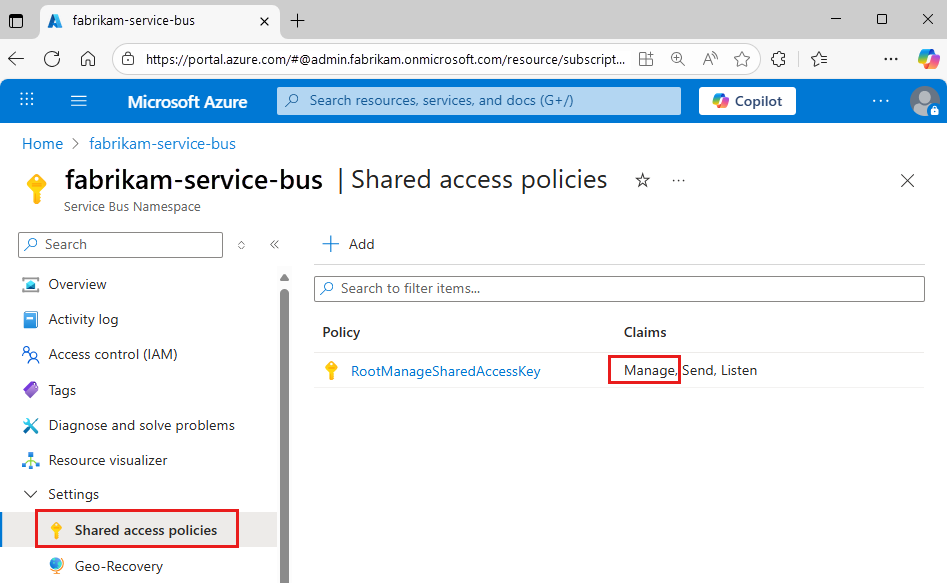 在边栏菜单中的 “设置”下,选择“ 共享访问策略”。 检查 你是否具有 该命名空间的管理权限。