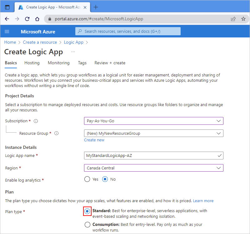在 Azure 门户中,开始创建标准逻辑应用。 在“创建逻辑应用”页上,在选择“标准”作为逻辑应用的计划类型后停止。