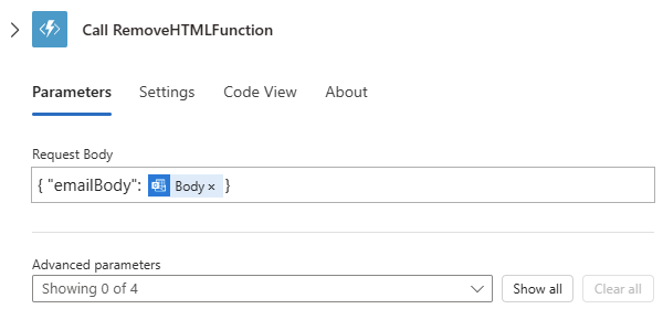 #r "Newtonsoft.Json" using System.Net; using Microsoft.AspNetCore.Mvc; using Microsoft.Extensions.Primitives; using Newtonsoft.Json; using System.Text.RegularExpressions; public static async Task<IActionResult> Run(HttpRequest req, ILogger log) { log.LogInformation("HttpWebhook triggered"); // Parse query parameter string emailBodyContent = await new StreamReader(req.Body).ReadToEndAsync(); // Replace HTML with other characters string updatedBody = Regex.Replace(emailBodyContent, "<.*?>", string.Empty); updatedBody = updatedBody.Replace("\\r\\n", " "); updatedBody = updatedBody.Replace(@" ", " "); // Return cleaned text return (ActionResult)new OkObjectResult(new {updatedBody}); }完成后,在“代码 + 测试”工具栏上选择“保存”,然后选择“测试/运行”。