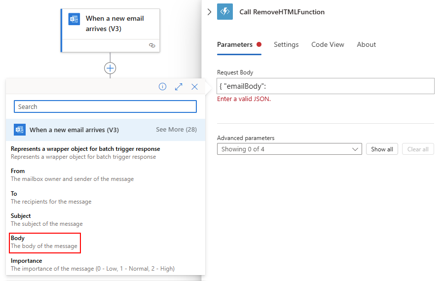 2.在“调用 RemoveHTMLFunction”部分中,选择“正文”。以下屏幕截图显示了为“为电子邮件正文创建 Blob”操作选择的输出: