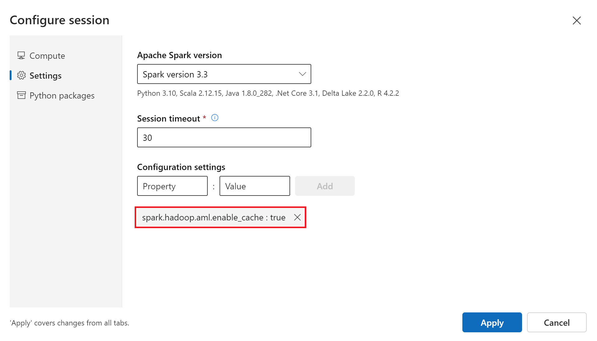 设置 spark.hadoop.aml.enable_cache 配置变量以 true 改进 Spark 会话 冷启动 时间。 使用会话级 Conda 包时,会话冷启动在首次启动时通常需要 10 到 15 分钟。 但是,后续会话冷启动需要三到五分钟。 在配置会话用户界面中的配置设置下定义配置变量。