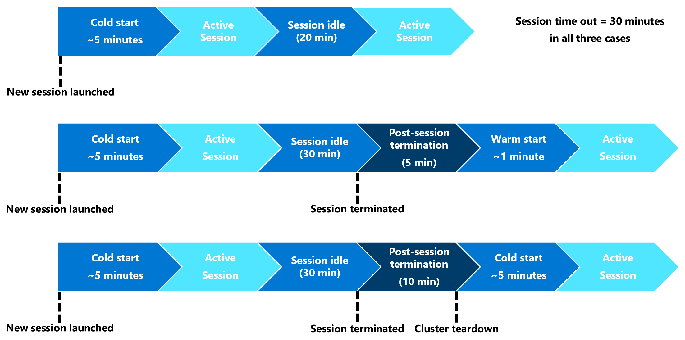 系统拆毁无服务器 Spark 计算资源后,提交下一个作业需要 冷启动。 以下可视化效果显示了一些会话空闲期和群集拆卸场景。
