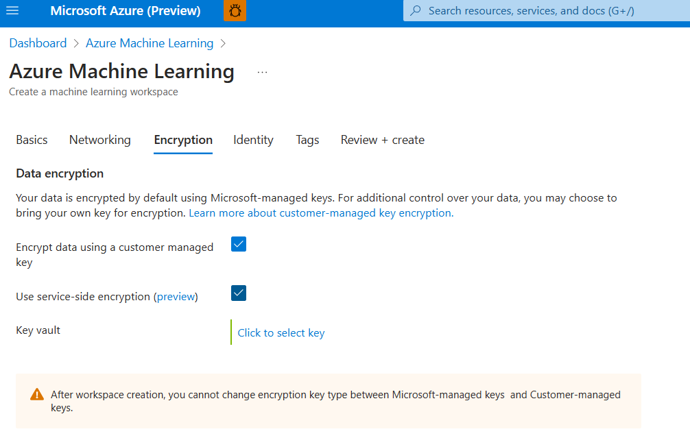 - 创建工作区后,工作区所依赖的资源的客户管理的加密密钥只能更新为原始 Azure Key Vault 资源中的其他密钥。