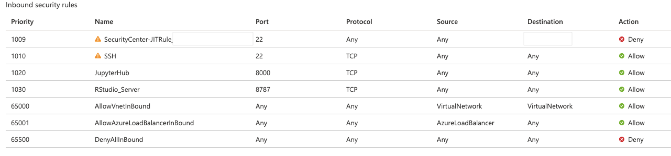 如果收到“无法访问此页面”错误,很可能需要调整你的网络安全组 (NSG) 权限。 在 Azure 门户中,查找资源组中的 NSG 资源。 若要从公共 Internet 访问 JupyterHub,必须打开端口 8000。 (以下图像显示此 VM 已配置为实时访问,强烈建议使用此配置。有关详细信息,请访问使用实时访问保护管理端口。)