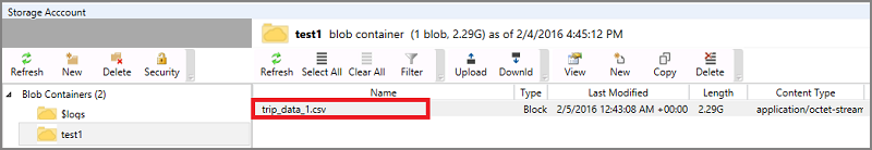 运行 AzCopy 命令以将文件复制到 Azure blob 后,文件会显示在 Azure 存储资源管理器中。
