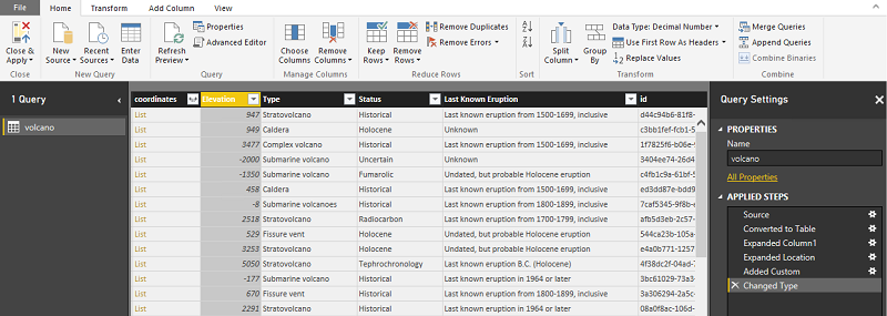 #"Expanded Column1" = Table.ExpandRecordColumn(#"Converted to Table", "Column1", {"Volcano Name", "Country", "Region", "Location", "Elevation", "Type", "Status", "Last Known Eruption", "id"}, {"Volcano Name", "Country", "Region", "Location", "Elevation", "Type", "Status", "Last Known Eruption", "id"}),