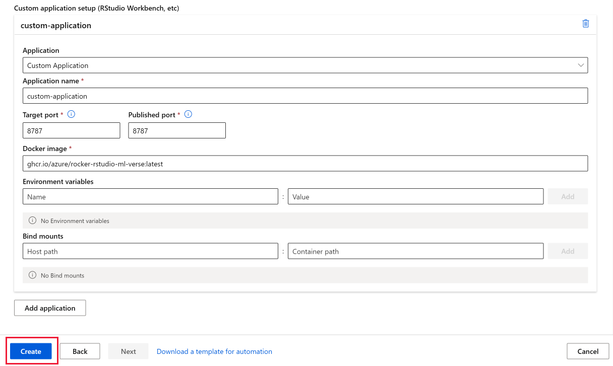 选择“创建”以将 RStudio 安装为计算实例上的自定义应用程序。