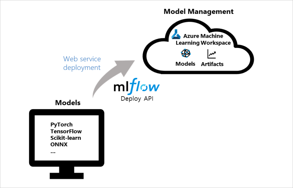 下图演示了 MLflow 部署 API 如何与 Azure 机器学习集成以部署模型。 可以使用常用的框架(如 PyTorch、TensorFlow 或 scikit-learn)创建模型作为 Azure Web 服务,并在工作区中管理服务: