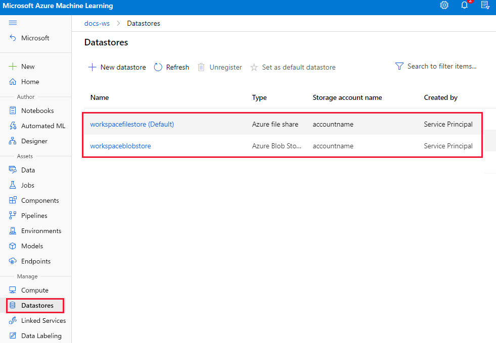 对默认存储账户启用托管标识身份验证。 每个 Azure 机器学习工作区都有两个默认存储帐户:一个默认的 Blob 存储帐户和一个默认的文件存储帐户。 这两个帐户都是在创建工作区时定义的。 还可以在“数据存储”管理页面中设置新的默认值。