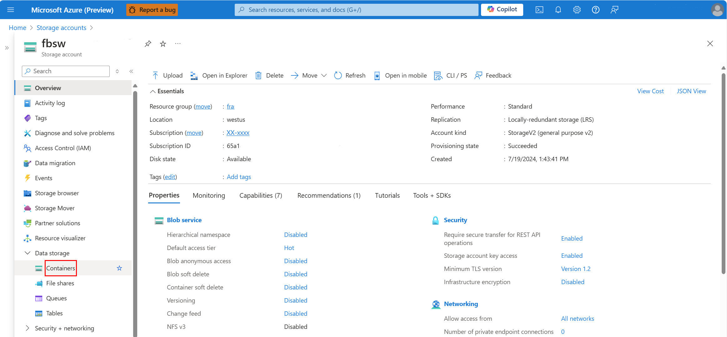 作业历史记录文档可能包含用户的个人信息。 这些文档存储在 Blob 存储中的存储帐户中,具体位置为 /azureml 子文件夹中。 可以从门户下载并删除数据。 首先,在 Azure 门户中选择“存储帐户”Azure 服务,如以下屏幕截图所示: