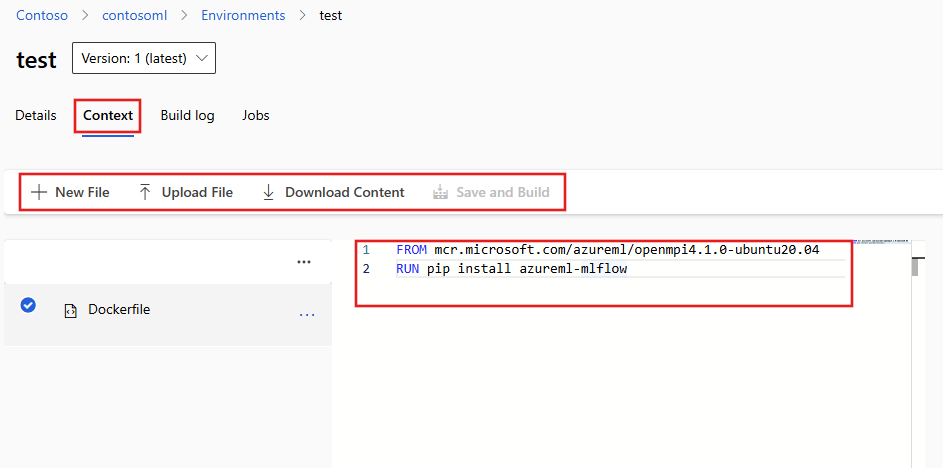 选择“上下文”选项卡以上传其他文件或编辑现有的 Dockerfile。 使用“保存并生成”以保存更改并重新生成上下文。