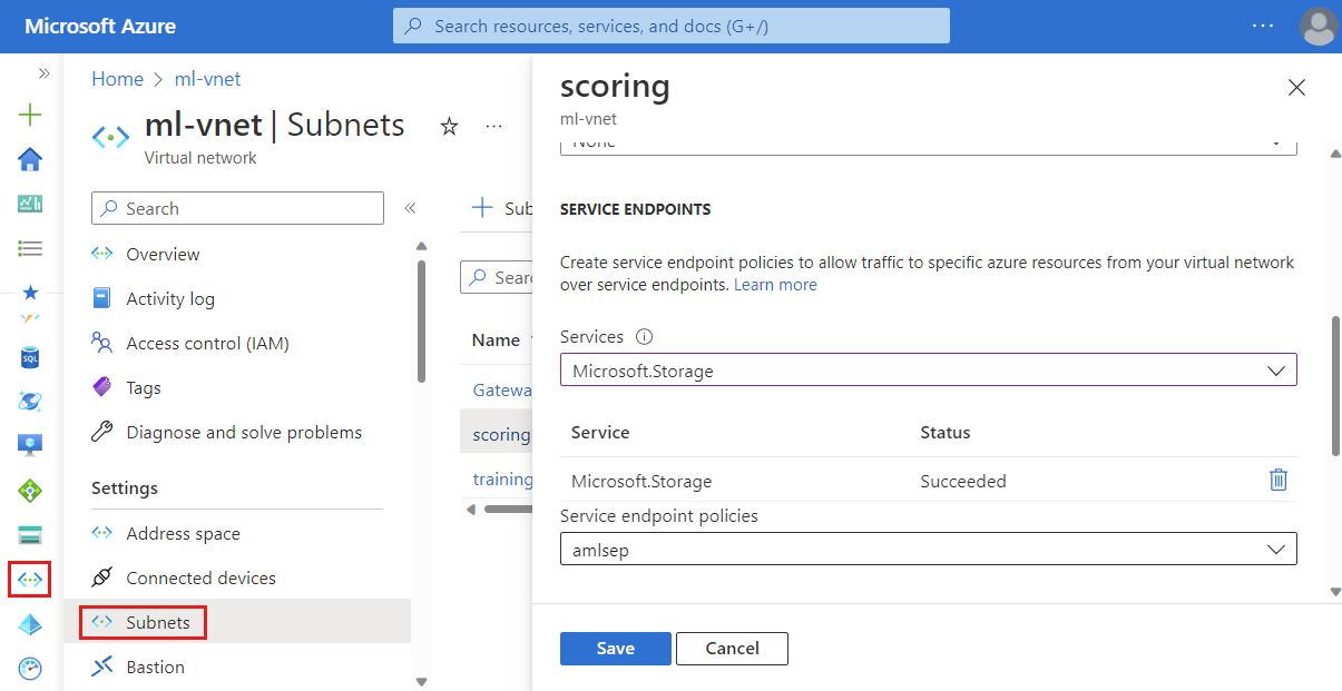 按照以下步骤,为包含 Azure 机器学习计算群集和计算实例的子网启用存储终结点: