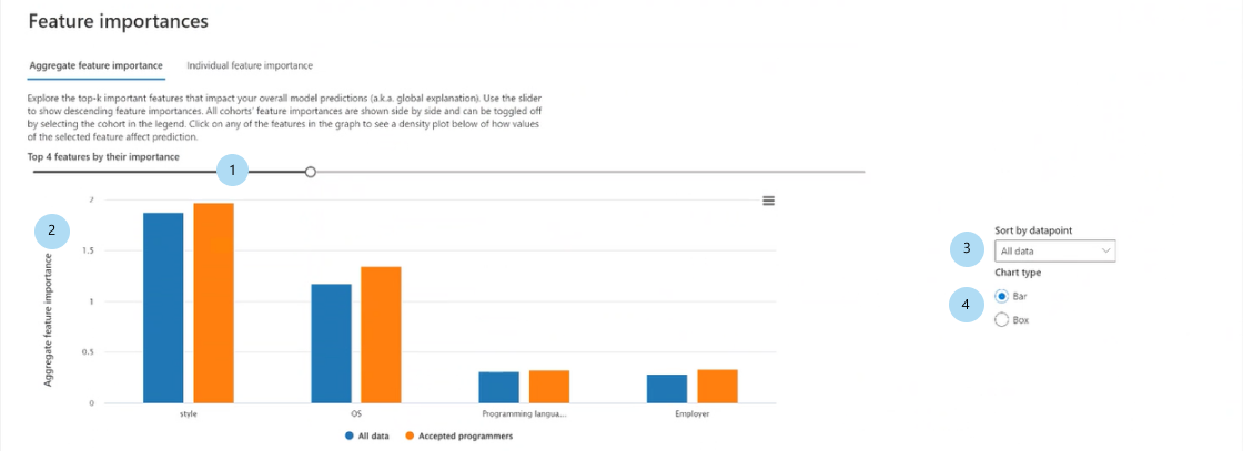 使用模型解释组件可以查看模型预测中最重要的特征。 可以在“聚合特征重要性”窗格中查看影响模型总体预测的特征,或在“单个特征重要性”窗格中查看单个数据点的特征重要性。