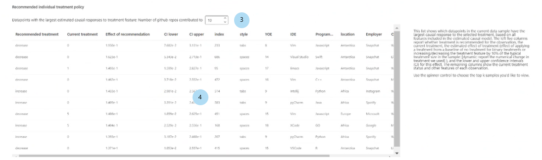 显示按建议的处理特征的因果效应排序的前 k 个数据点样本:选择要表中显示的数据点数。